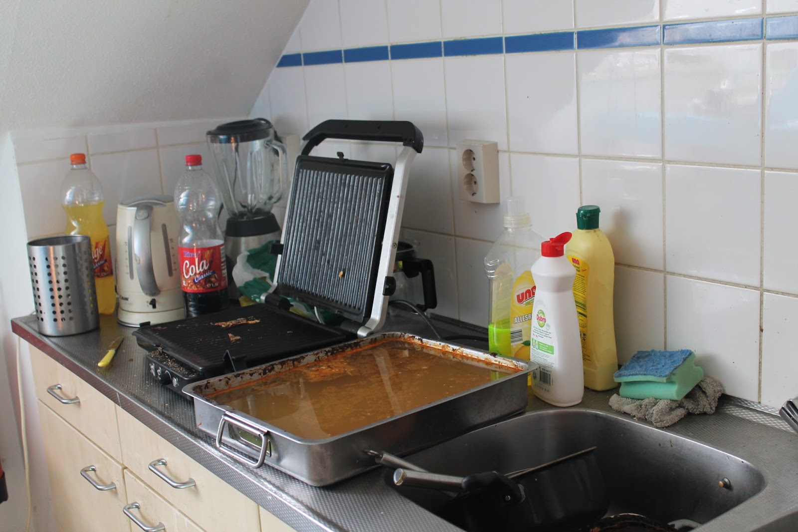 Tsja, dit weet je natuurlijk als je in een studentenhuis gaat wonen. Maar toch. Het is een kleine moeite om alleen je eigen zooi achter je kont op te ruimen, maar in de praktijk staat het hele aanrecht vol met verpakkingen, oud papier, vieze borden en ga zo maar door.