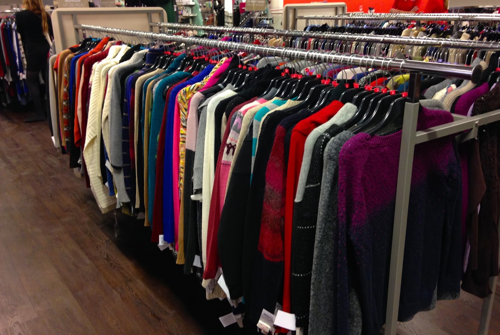 Deze foto laat goed zien wat de indeling van de winkel is. De kledingstukken hangen op maat en niet op kleur en/of stijl. |
