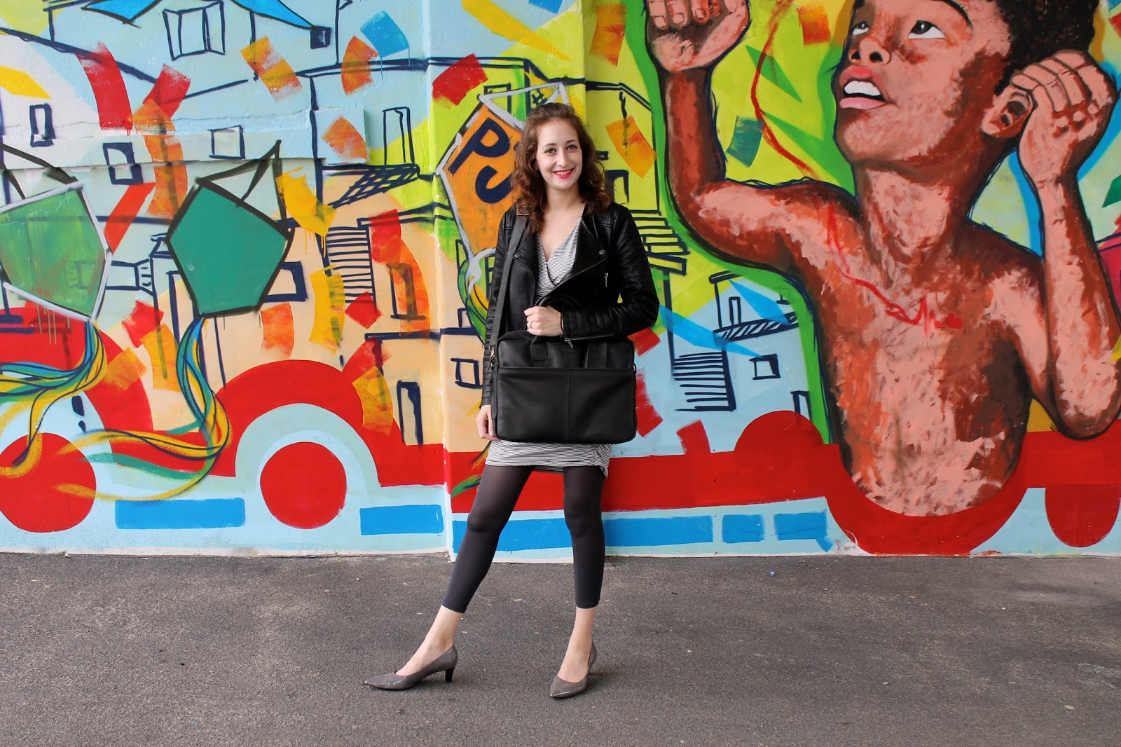 Wat een toffe achtergrond heb je uitgekozen! Mooie tas en de rode lipstick staat je super!
