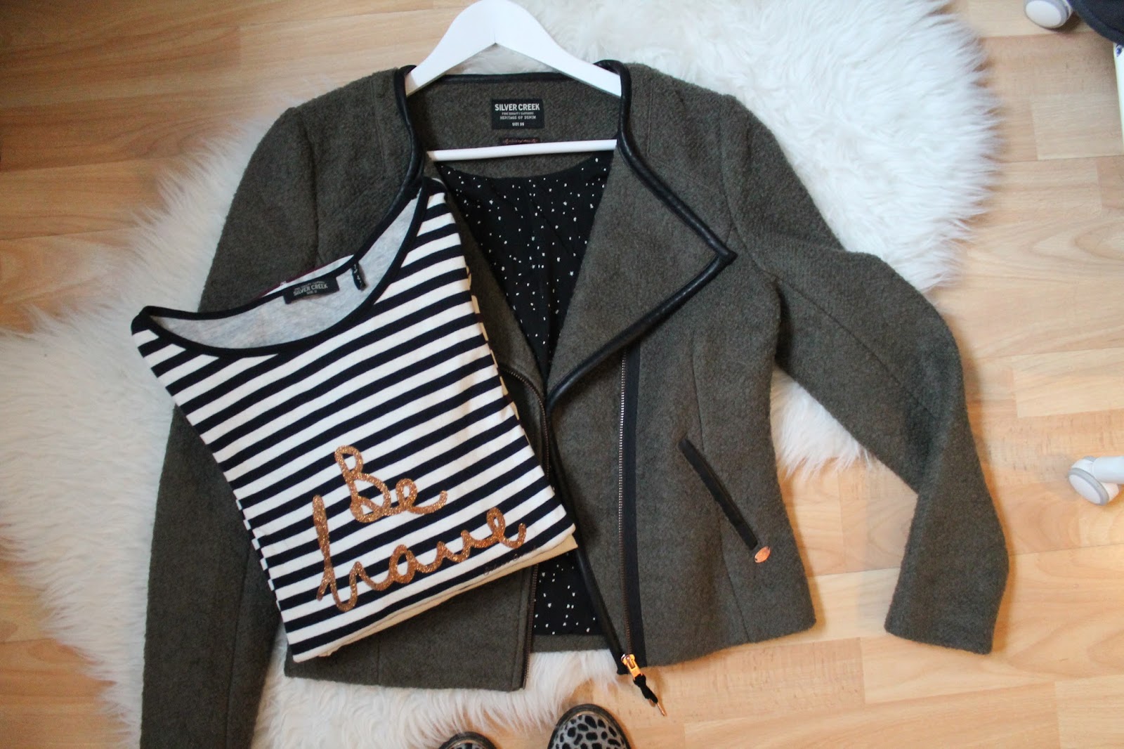 Het eerste item wat ik zag, was dit donkergroene wollen jasje. Hij zag er heel mooi en stijlvol uit. Daarnaast kan ik dit jasje ook prima naar mijn werk dragen. Naast het jasje kocht ik twee streepjes truitjes. Een wit-zwart met de tekst ‘Be Brave’. Dit t-shirt is gevoerd en daardoor extra warm. Het andere gestreepte truitje is eigenlijk een basic truitje van een iets wat dikker stof. De gestreepte truitjes zijn ook leuk onder het jasje. Zoals je begrijpt ben ik héél blij met deze items die ik samen voor €60,- mee naar huis mocht nemen, in plaats van €190,-. Een mooie korting dacht ik zo! 🙂
