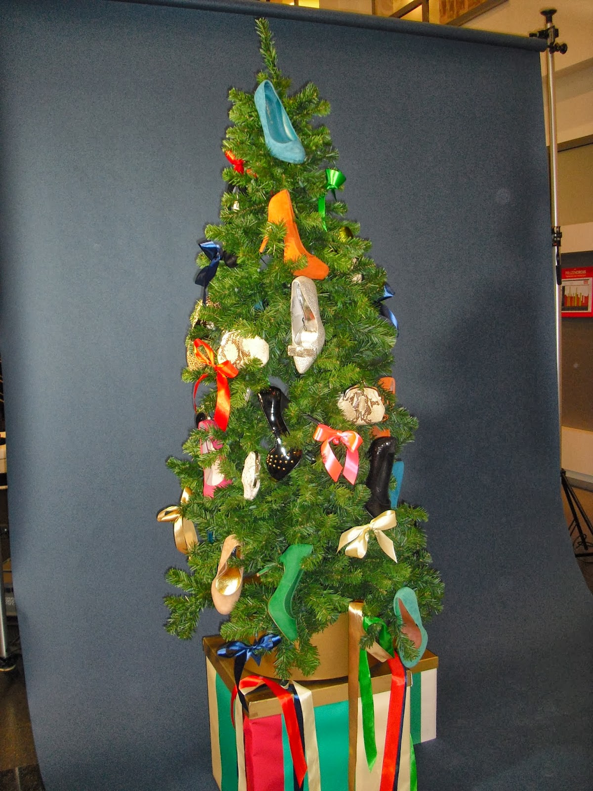 Er werden dan foto’s gemaakt bij een kerstboom vol met hakken.